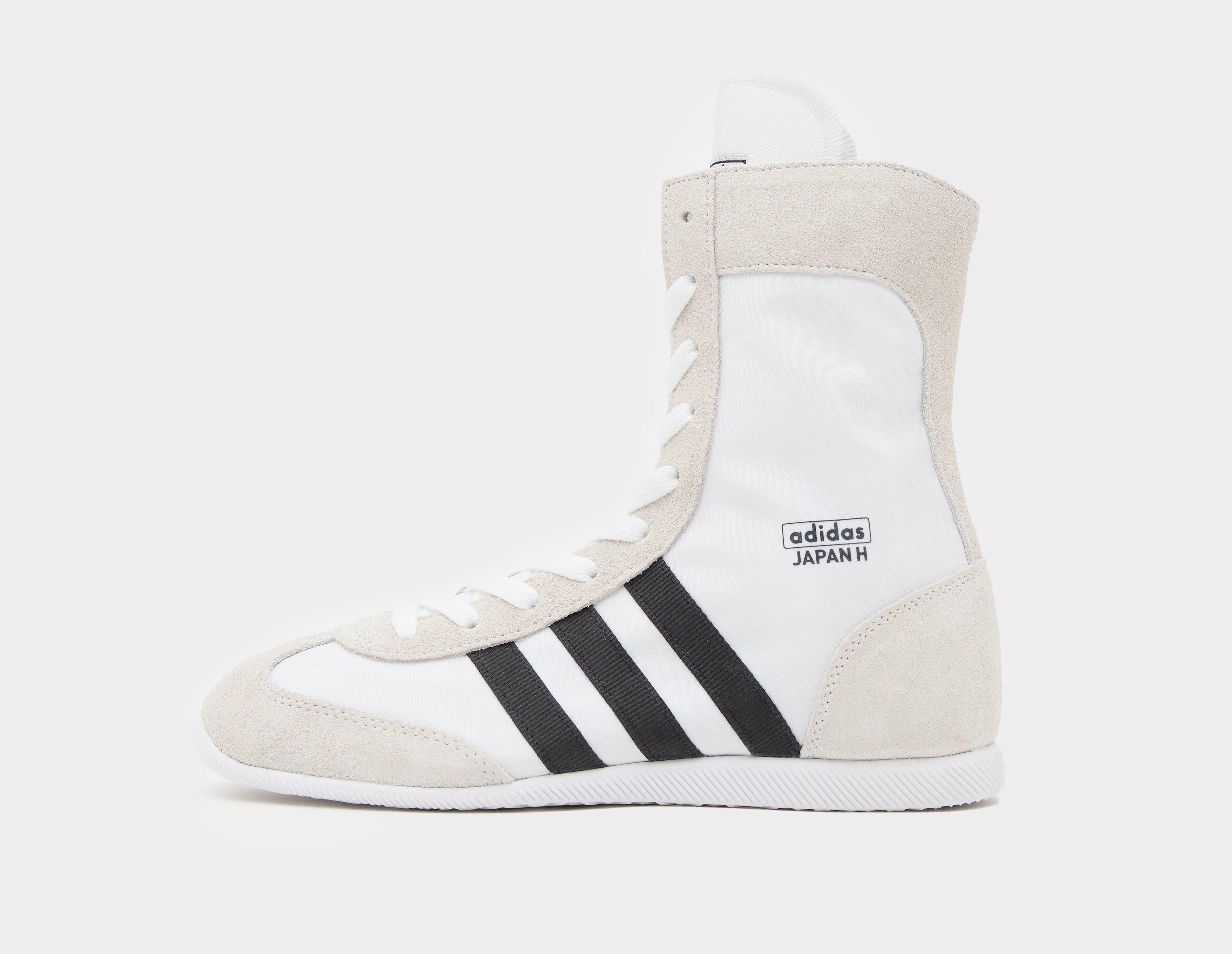 adidas Originals lanza su Japan H en "Cloud White", inspirada en las botas de boxeo de archivo Knockout. Con un espíritu ochentero, la parte superior de nailon que se eleva por encima del tobillo está bordeada por capas de gamuza suave y las 3 rayas de tela negra añaden un contraste audaz a los laterales. En la planta del pie, una suela de goma fina y estilizada ancla el diseño y la marca adidas Japan H añade el toque final. | JQ7635